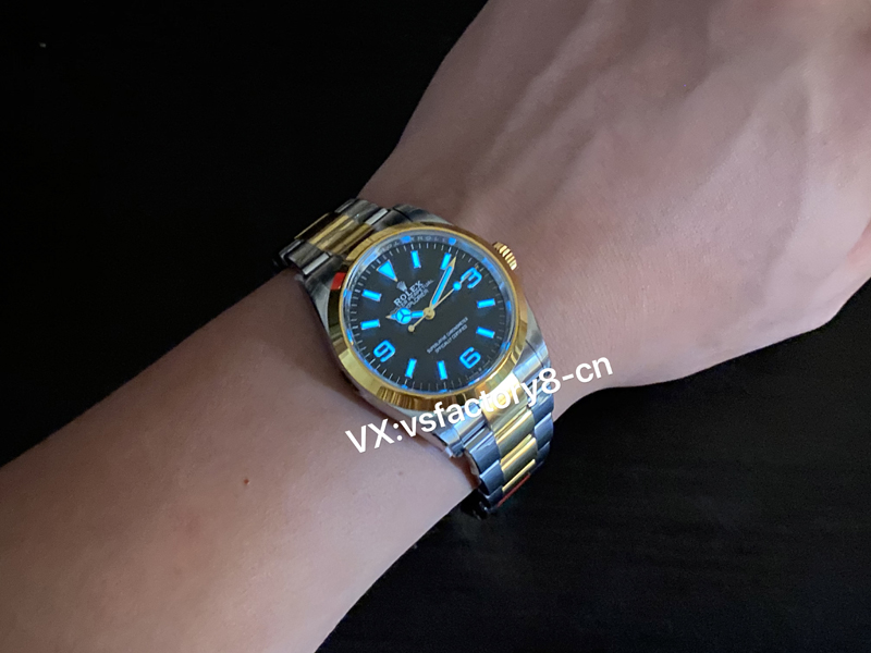 1:VS廠勞力士36m間金探險家探一的表殼使用904L精鋼材質(zhì)與鍍18K金相結(jié)合的設(shè)計,形成獨特的“間金”效果。VS廠在這一設(shè)計上特別注重配色的統(tǒng)一和金屬塊的比例,使得整個表殼顯得既低調(diào)又奢華。表殼的拋光工藝相當(dāng)講究,鏡面光澤與啞光效果的相互映襯,展現(xiàn)出高檔腕表應(yīng)有的格調(diào),表殼采用了多種拋光工藝,既有拉絲處理的部分,也有鏡面拋光的部分,保證了美觀的同時,也給人極強的觸感。