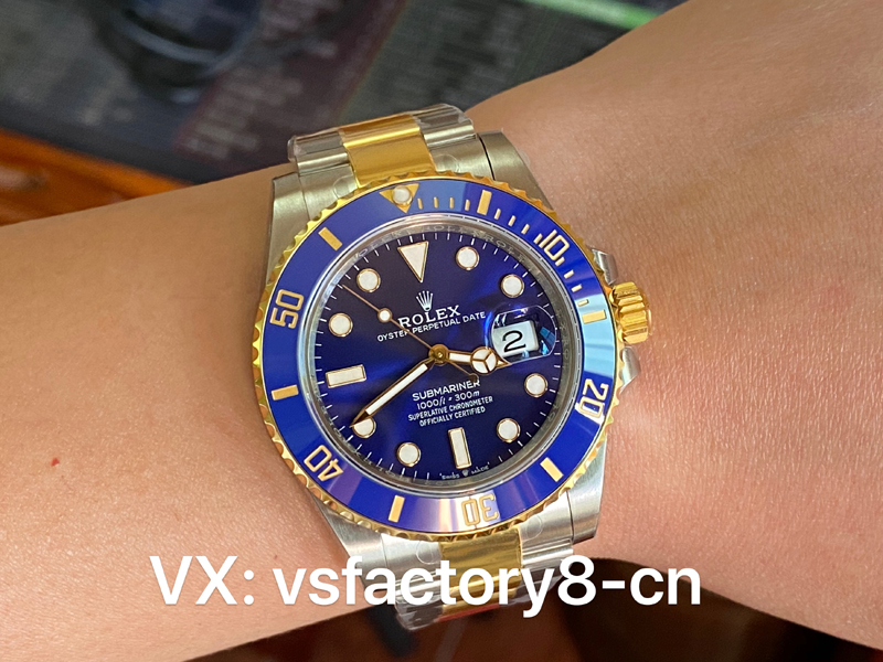 2:VS廠勞力士41m間金藍水鬼的表殼材質是采納了904L精鋼鍛造,而表殼經過VS廠嚴格的拉絲和拋光處理,完美呈現出一致正品色澤,這一點是完全沒有破綻現象,表帶采用了904L精鋼材質與真空電鍍18K黃金的結合,體現了勞力士的傳統工藝。每個鏈節都經過精細打磨,過渡自然,佩戴起來也非常舒適。
