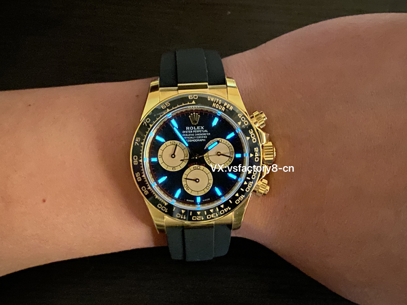 2:在細節上,VS廠將勞力士小怪獸迪通拿的工藝發揮到了極致,表圈采取了自主燒制的黑色陶瓷材質,這一點做到了對版,陶瓷圈計時刻度細節非常精湛,一致原裝金色刻度,并且不會出現顆粒瑕疵,平面整潔,表圈邊緣也是新款迪通拿的改變,增加了一個黃金圈,VS工廠將毫無疑問的還原一步到位!