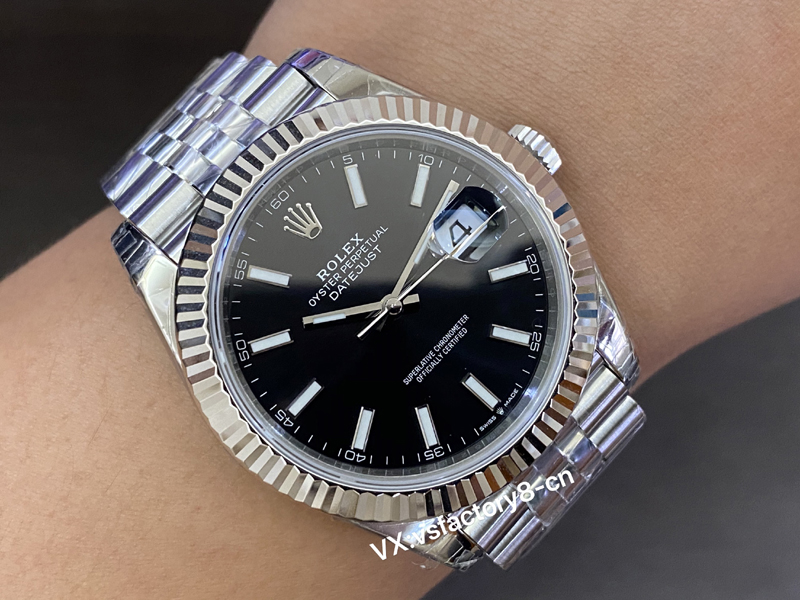 4:VS廠在勞力士日志表盤還原工藝非常精湛,采用了一致黑色還原,我們都知道黑色表盤是無存在有色差現象,分針和時針以及秒針經過細致的打磨,展現出了圓潤,刻度的邊緣也經過處理,可以看出VS廠在表盤的細節非常用心,表盤印刷排序一致原版,十二點大皇冠LOGO復刻的非常立體,指針和刻度填充原版一致瑞士夜光涂層,效果一致原版。