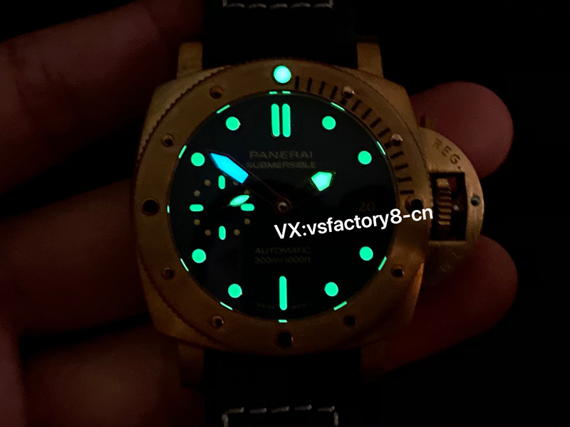 4:表盤復刻還原設計方面,VS廠忠實還原了青銅沛納海PAM1070的“三明治”規格表盤,盤面一致深藍色復刻,顏色方面其無色差現象,VS廠在表盤字體及標志的復刻上也下了不少功夫,每個字母、每個數字的位置均與正品保持一致,給人一種身臨其境的感覺,即便是微小的刻度線,VS廠也進行了精細的處理,確保在光線的反射下,依然顯得干凈利落,刻度和指針均填充瑞士夜光粉,特別是在夜間,指針和時標的夜光效果表現出色,能夠在黑暗中清晰讀取時間。