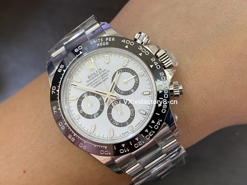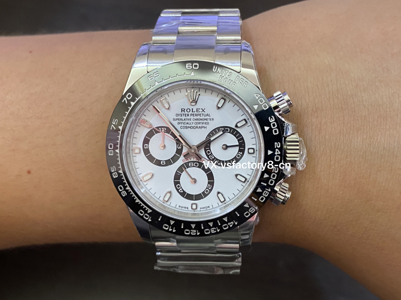 4:表盤的復刻還原設計上,VS廠真的是用心良苦,白色表盤和清晰的標記使得時間讀數變得輕而易舉,對于表盤是顏色也是完全對版,指針VS廠采用了原版勞力士的獨特復刻還原設計,指針的形狀和長度與時標相得益彰,時標部分,VS廠確保其與正品使用了同樣的鍍銀技術,確保在不同光線下都能散發出獨特的光澤,計時功能在VS廠的這款表中得到了完美的還原,各個按鍵觸感良好,操作流暢,的的確確是非常值得入手。