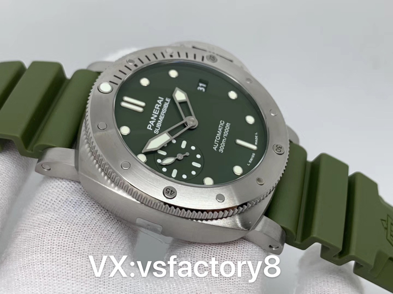 5:VS廠沛納海PAM1055的表盤復刻還原設計同樣出色,真正同步原版一致軍藍色復刻還原,軍綠色的表盤彰顯獨特、大膽的氣質,VS廠在復刻沛納海pam1055過程中采用了高質量的油墨,并經過特殊處理,使得表盤上的數字和標記更加清晰,并具備持久的耐磨性,在表盤9點鐘位置設有小秒盤,3點鐘位置為日歷顯示功能,其原版一致“三明治”規格設計,分距一致原版,指針和刻度填充瑞士夜光粉涂層,這一技術上的創新,讓復刻表在功能性上不輸于正品。