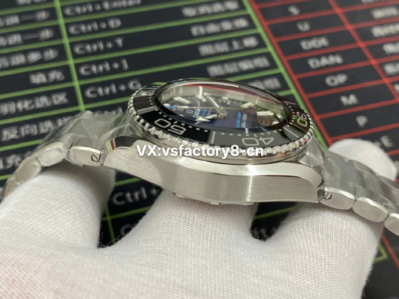 2:VS廠歐米茄漸變藍海王海馬600米復刻表的表圈一致原版工藝材質,亮黑色陶瓷表圈飾有Liquidmetal潛水刻度,完美同步單向旋轉表圈功能設計,表圈材質使用了陶瓷材質,表圈的鋸齒狀復刻設計不僅完美展現,其實也增加了表圈的摩擦力,在這一點VS廠也同步原版細節工藝,是非常值得入手的一款復刻表。