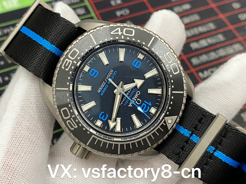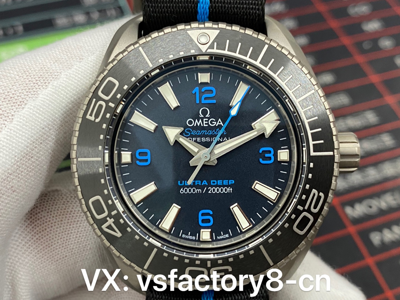 5:VS廠歐米茄鈦海王海馬600米同步原版一致黑色陶瓷的鈦金屬表盤搭配藍色數字時標和漸變效果的藍色中央秒針,漸變的盤面搭配上炭黑色的表圈,用白色的夜光涂層來作為腕表的亮色點綴,這種細節上的雕琢,體現了VS廠對品質的嚴格要求。表盤英文印刷整體細節非常立體感超強,指針和刻度均填充了瑞士夜光粉涂層,表盤上所有的做工品質復刻的非常一步到位。