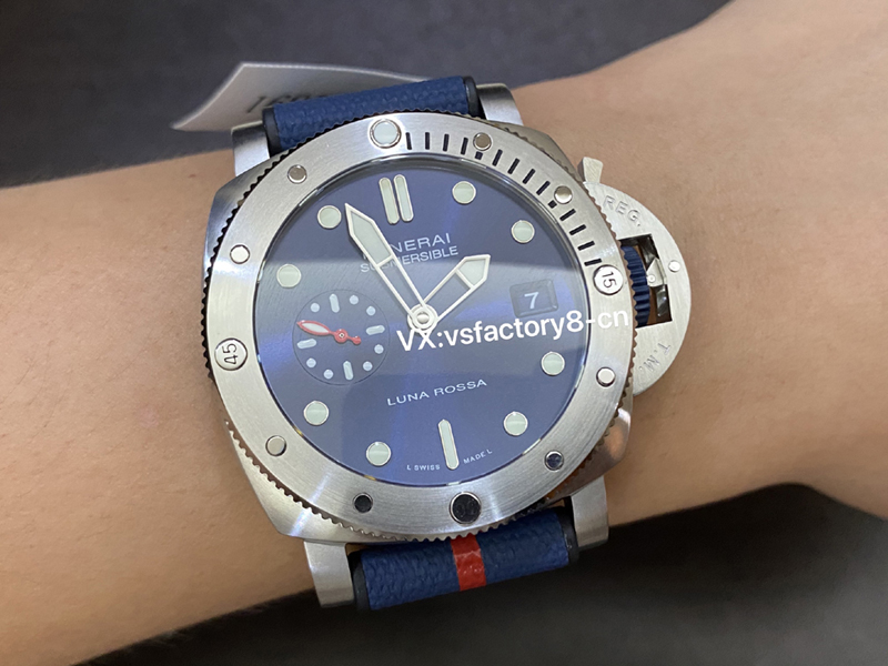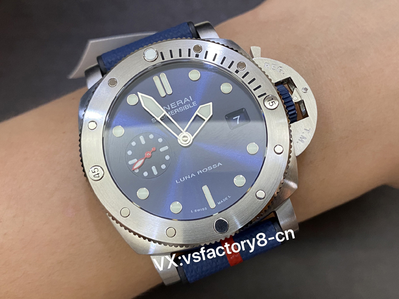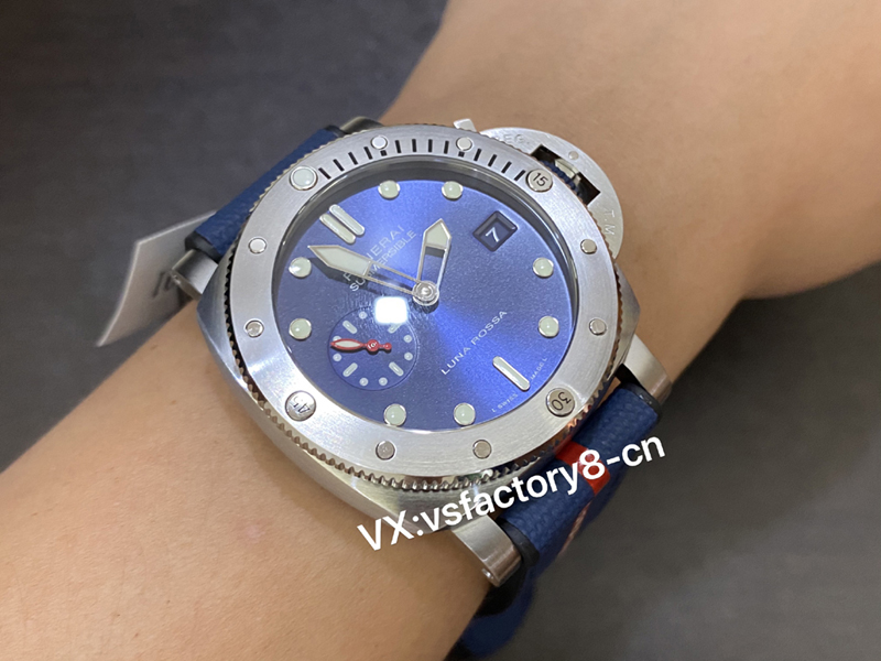 5:VS廠在此款沛納海pam1391同步原版一致藍色太陽放射紋處理,這一點是做到了完全對版正品,是非常值得入手,表盤會隨光照角度變化。大號棒狀時標與圓點時標,還有時分針以及表圈時標,都涂覆白色Super-LumiNova?夜光涂層, 盤面9點鐘位置設(shè)有小秒盤,魚雷指針做成紅色,醒目,也為藍盤更添動感,表盤上的所有細節(jié)做工同步了原版,還原非常精湛也很值得入手解毒。