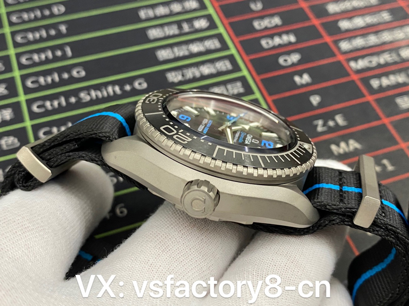 1:VS廠歐米茄鈦海王海馬600米復刻手表在外觀設計上高度還原了正品的工藝材質,表殼采取了與原版一致鈦金屬材質復刻,鈦殼款經過噴砂處理,極大減輕了復刻表的重量,同時也保證了其耐腐蝕性和堅固性,在這款復刻表中,我們可以看到VS廠在表殼加工完成后,經過多道工序打磨,使其表面光滑、細膩,展現出一種原版工藝細節。