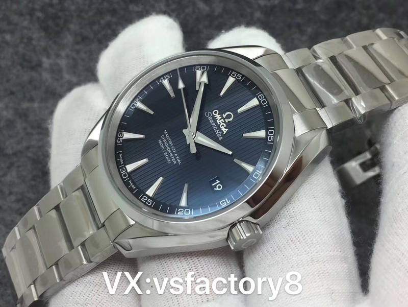 3:VS廠在表盤上復刻原版一致工藝設計,真正同步了藍色的亮漆表盤飾有Aqua Terra系列標志性的“柚木概念”垂直紋理,層次感非常強烈,被VS工廠一覽無余的攻破,做到了原汁原味,表盤標識和刻度同樣值得一提,VS廠對其進行了精確的復刻,采用了原版相同的字母字體和布局,使整體視覺效果達到最佳狀態,大三針的設計。小時刻度為鍍銠材質,同材質的拱形中央時針、分針和秒針的側面均為光亮打磨,中間填充夜光材質,于細節處彰顯VS工廠非凡匠心。