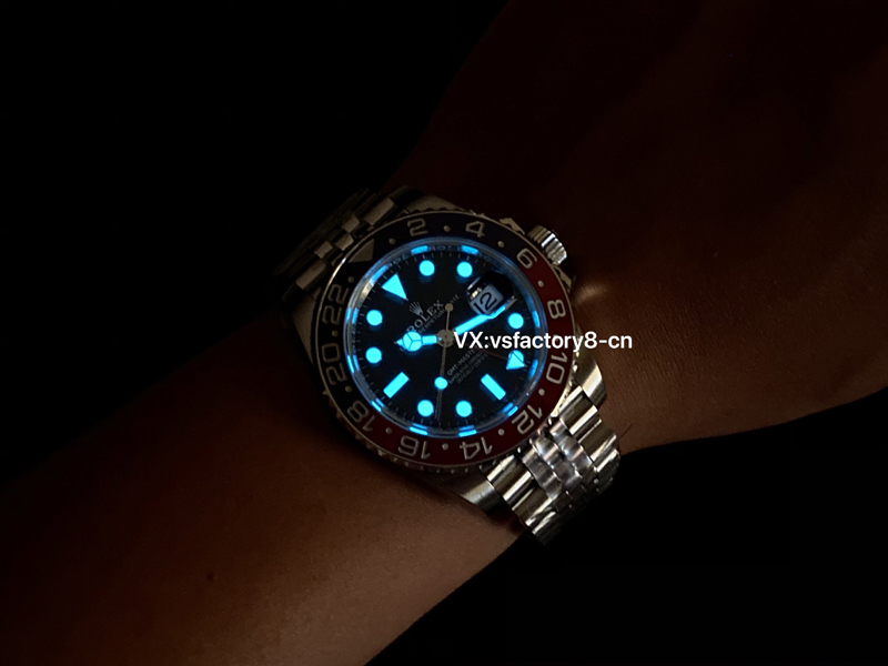 5:VS廠勞力士可樂圈的表盤使用了黑色搪瓷材質鍛造,光澤感和質感非常強烈,表盤上指針的造型、大小、刻度以及GMT針的復刻還原設計,做到了一致,十二點大皇冠LOGO非常立體,表盤英文印刷字體細節非常細膩,無毛邊瑕疵現象,指針和刻度均填充了瑞士夜光粉涂層,效果顏色做到原版一致。