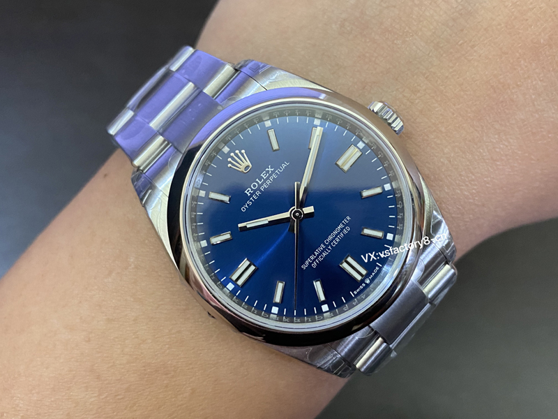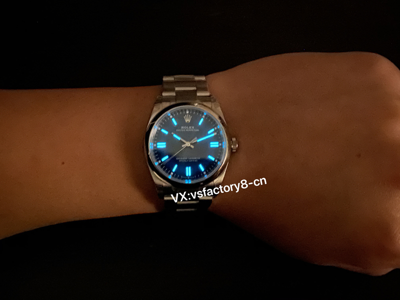 4:VS廠在勞力士蠔式恒動復刻表同步原版一致藍色表盤還原設計,藍色的表盤在光線的折射下閃耀著迷人的光澤,奔馳針設計,刻度和指針邊緣均經過打磨圓潤,十二點位置大皇冠LOGO,立體感強烈,細長的時針和分針搭配著的纖細秒針,使得整個表盤的視覺效果尤為協調,均填充了瑞士夜光粉涂層,細節均勻,夜光顏色同步原版一致。