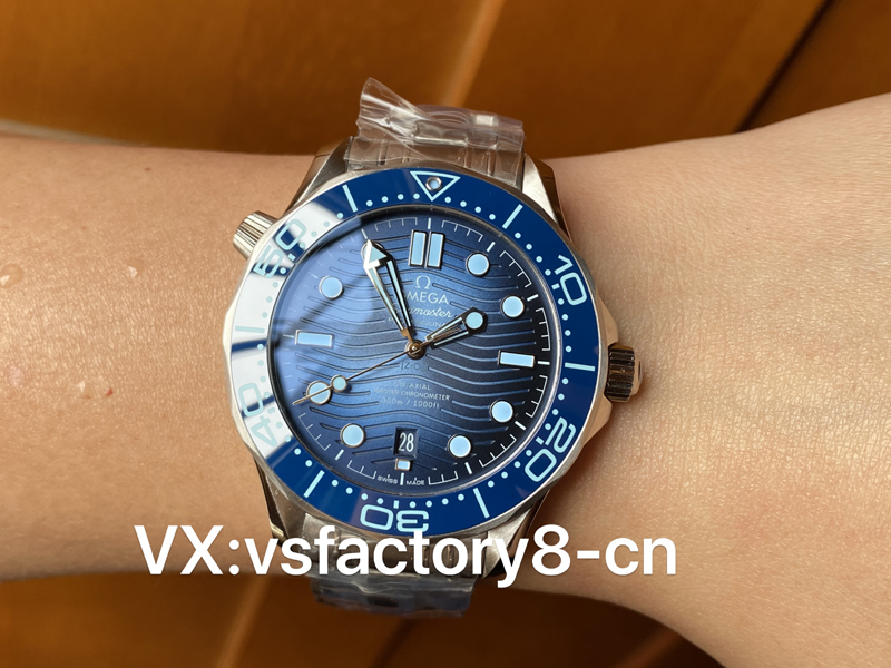 4:VS廠歐米茄冰藍面海馬300米V4版的外觀無疑是其最引人入勝的表盤部分之一,VS廠入手原裝正品復刻一致冰藍色波浪紋表盤還原,在波浪紋理的陶瓷盤面色調上,呈現出既有冰藍,又有深海幽藍,中央的冰藍色調運用了一個巧妙地漸變色彩變幻,由淺放射至盤面外緣的深藍,表盤上采用了立體的時標,搭配精致的指針,使得整個表盤看起來立體而生動。尤其是在陽光的照射下,冰藍色的反光效果令人心動,表盤印刷字體細膩,整體表盤復刻還原非常精湛。
