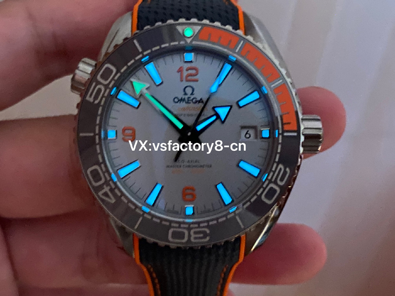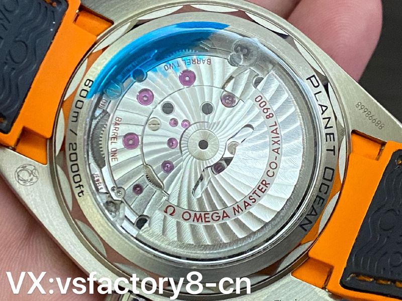 6:VS廠歐米茄灰色四分之一橙海馬600米復刻表搭載了丹東廠自主研發的8900一體機芯,丹東8900機芯的運行精度高,日差在±5秒之內,機芯的振頻為28800次/小時,確保了計時的準確性,此外,丹東8900一體機芯的打磨工藝精細,能夠在觀察透底時呈現出美麗的飾紋,彰顯出一款最高版本復刻表應有的面貌。
