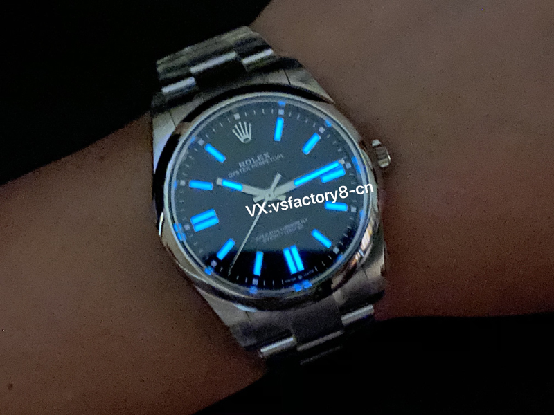 4:表盤的復刻還原設計非常完美,VS廠勞力士蠔式恒動復刻表的同步了原版一致黑色表盤設計,其無色差現象,指針和時標采用了與真品相同的鍍銠,瑞士夜光材料也與真品一致,使得在暗光環境中依然能夠清晰讀取時間,指針的設計經過多道工序打磨,確保其在轉動時流暢無阻,時標的搭配不僅提高了表盤的可讀性,也提升了整體的美觀性,表盤英文印刷字體非常立體,實心中軸,證明了VS廠的蠔式恒動復刻表是非常值得入手。