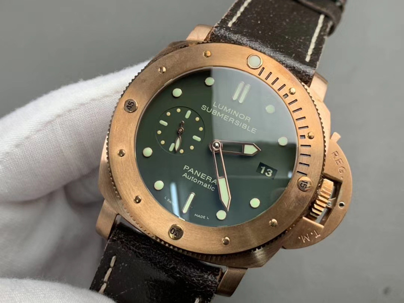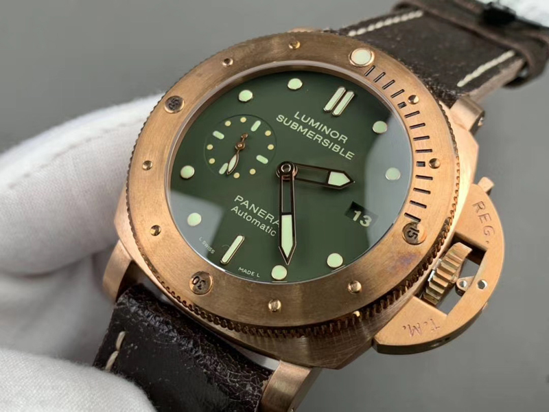 5:VS廠沛納海pam382青銅復刻表的盤面復刻還原一致綠色設計,真正是達到了最接近版本,表盤、表針的設計也進行了相應的改進,三文治表盤設計以及傳統的時、9點鐘小秒針顯示、3點的日歷窗,盤面英文字體非常清晰立體,指針和刻度打磨圓潤,均填充了瑞士夜光粉涂層,達到了原裝工藝細節,也同時展現了最高版本的復刻表。
