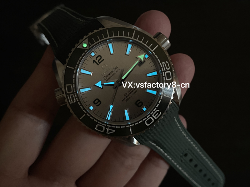 4:VS廠這款歐米茄綠鋼面海馬600米復刻腕表的表盤設計巧妙,真正同步了原版一致鋼色表盤還原,完全看不出有色差現象,這種顏色在大眾市場上并不常見,表盤的中心是由寬大的指針指示時間,時針和分針均經過夜光處理,三點鐘位置設置了日期顯示窗口,清晰易讀,盤面英文字體也非常立體,完全堪稱天花板級別的品質細節做工。