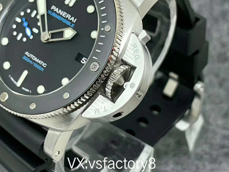2:VS廠沛納海pam683復刻還原原版一致精鋼單向旋轉表圈,配黑色嵌入式陶瓷轉盤,表圈的陶瓷材質經過VS廠多次的研發燒制,才能達到了與原版一致想工藝細節,而且表圈上復刻還原潛水標志以及十二點位置夜明珠,做工細節很有立體感。