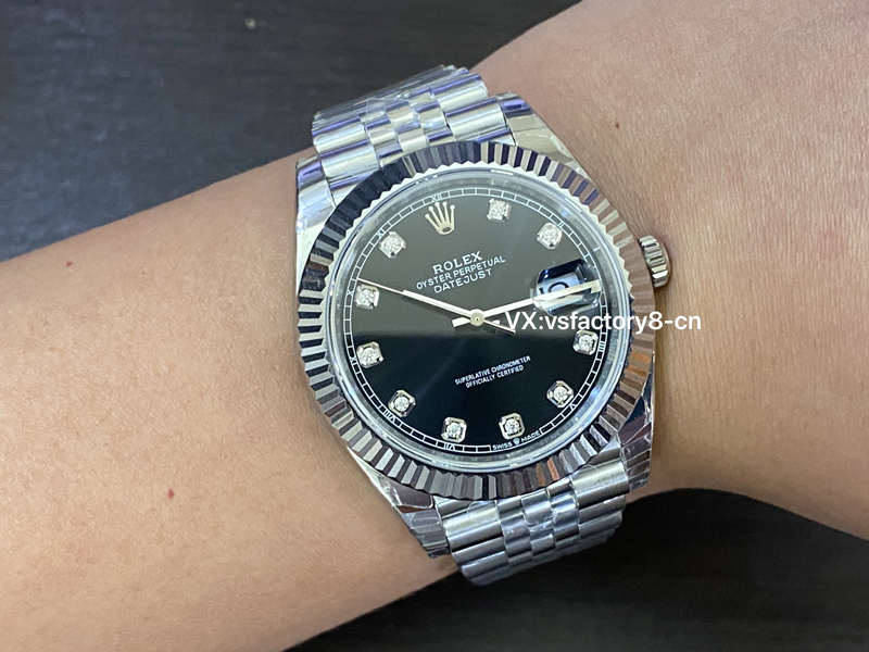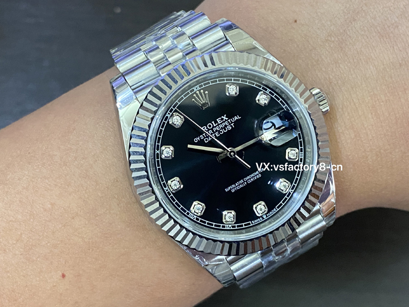 4:VS廠勞力士日志復刻一致黑色表盤結合臺灣莫桑鉆石刻度的還原設計,采取了臺灣進口莫桑鉆,并非皓石,臺灣莫桑石的切割經過精細打磨,展現出晶瑩剔透的光澤,令人忍不住多看幾眼,黑色的盤面無色差,十二點位置大皇冠LOGO立體感非常強烈,盤面印刷字體整潔,“奔馳大三針”復刻還原,實心中軸,指針打磨圓潤,從表盤所有的細節做工復刻還原來看是非常值得入手。