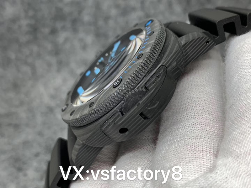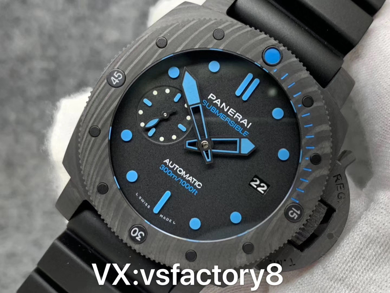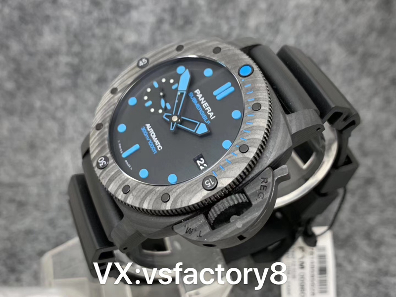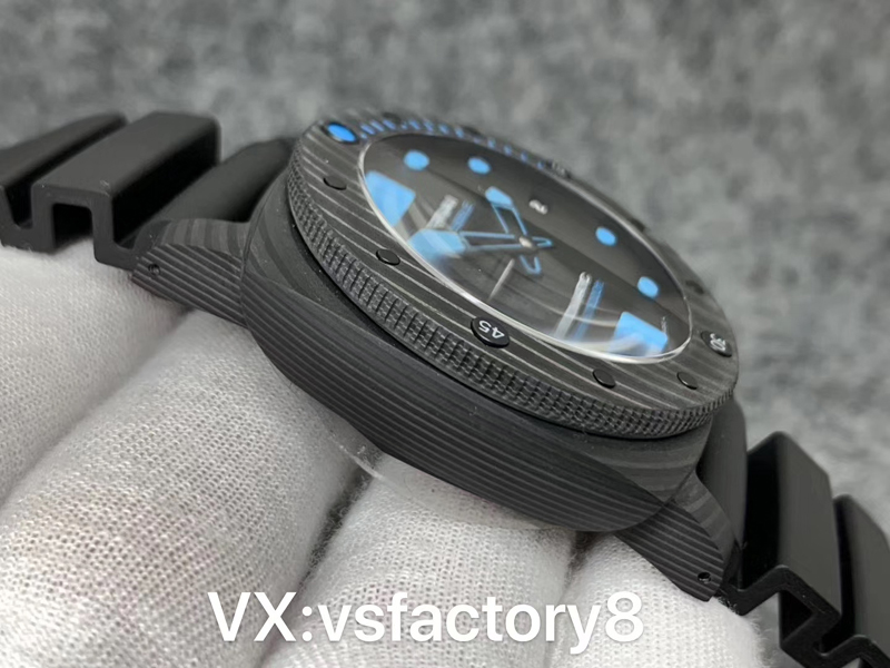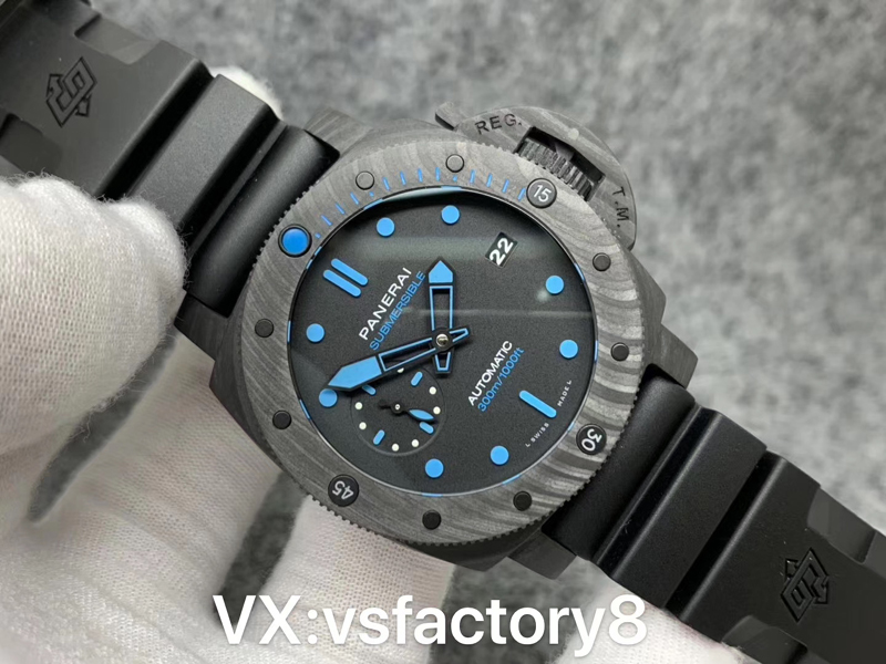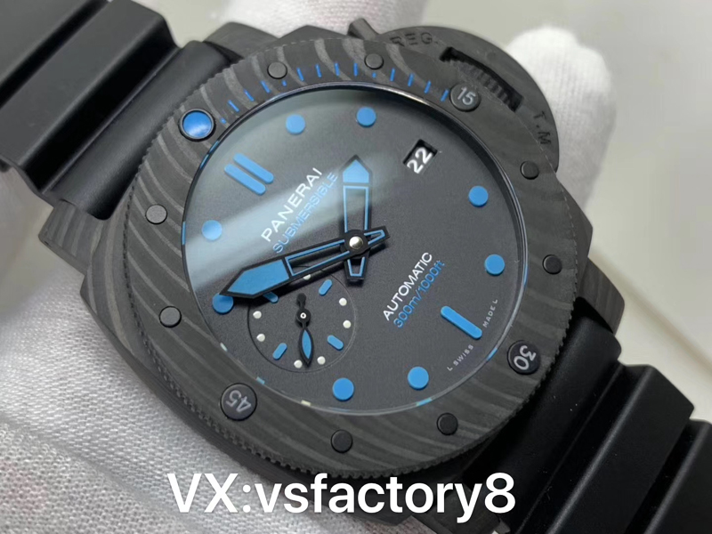 VS廠沛納海PAM960 SUBMERSIBLE系列自動(dòng)機(jī)械潛水腕表PAM01616(直徑47mm),VS廠沛納海PAM960(直徑42mm)CARBOTECH碳纖維表殼 ,潛水倒計(jì)時(shí)表圈, 表圈上有藍(lán)色刻度線, 藍(lán)寶石鏡面, 保險(xiǎn)護(hù)橋表冠 ,雕刻潛水艇圖案鈦合金PVD黑底蓋, 黑色表盤, 藍(lán)色表針和時(shí)標(biāo), 超強(qiáng)雙色夜光 ,分針和表圈夜光點(diǎn)藍(lán)色夜光用于潛水氧氣倒計(jì)時(shí) P.9010機(jī)芯 ,時(shí)針快調(diào) ,可逆調(diào)日歷 ,潛水伸縮橡膠表帶 ,鈦合金PVD黑針扣。