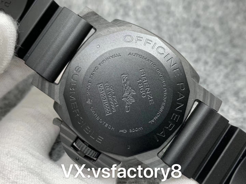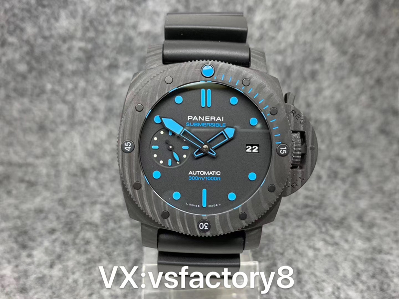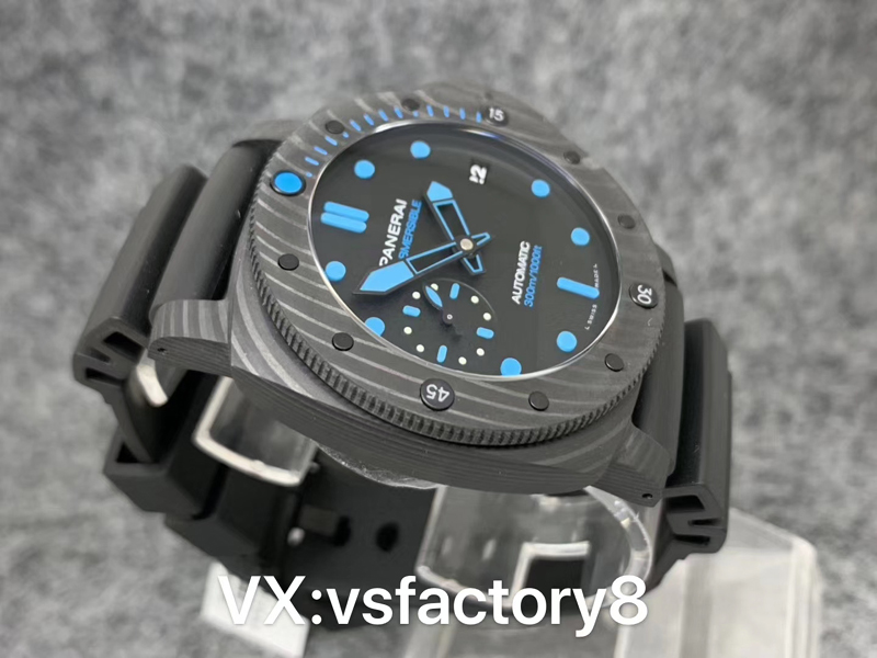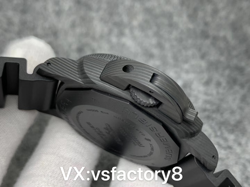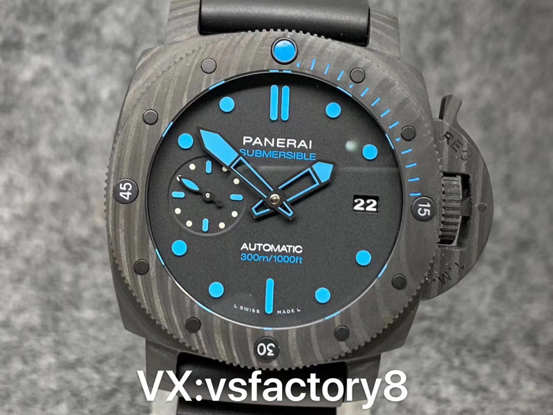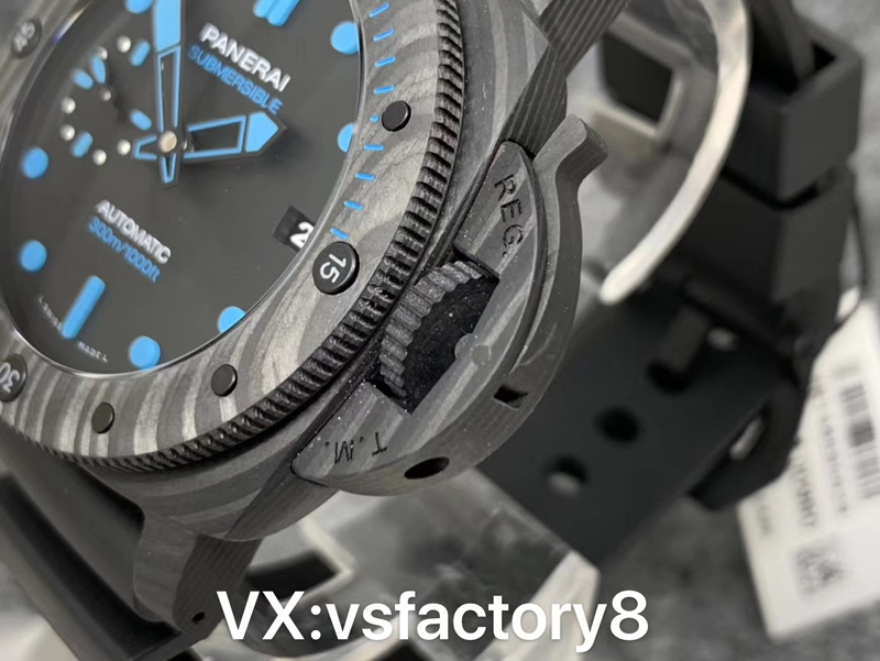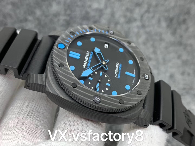 VS廠沛納海PAM960 SUBMERSIBLE系列自動(dòng)機(jī)械潛水腕表PAM01616(直徑47mm),VS廠沛納海PAM960(直徑42mm)CARBOTECH碳纖維表殼 ,潛水倒計(jì)時(shí)表圈, 表圈上有藍(lán)色刻度線, 藍(lán)寶石鏡面, 保險(xiǎn)護(hù)橋表冠 ,雕刻潛水艇圖案鈦合金PVD黑底蓋, 黑色表盤, 藍(lán)色表針和時(shí)標(biāo), 超強(qiáng)雙色夜光 ,分針和表圈夜光點(diǎn)藍(lán)色夜光用于潛水氧氣倒計(jì)時(shí) P.9010機(jī)芯 ,時(shí)針快調(diào) ,可逆調(diào)日歷 ,潛水伸縮橡膠表帶 ,鈦合金PVD黑針扣。
