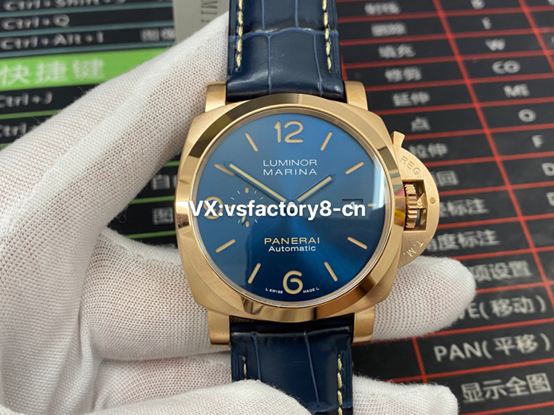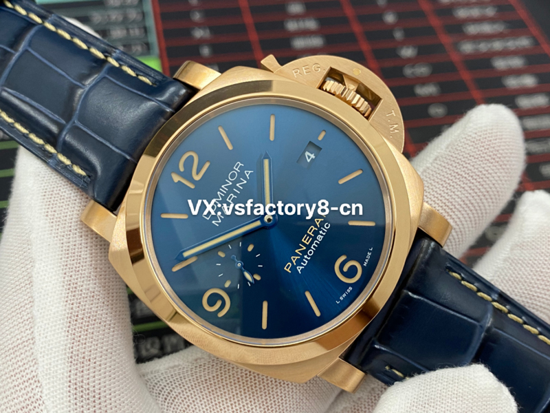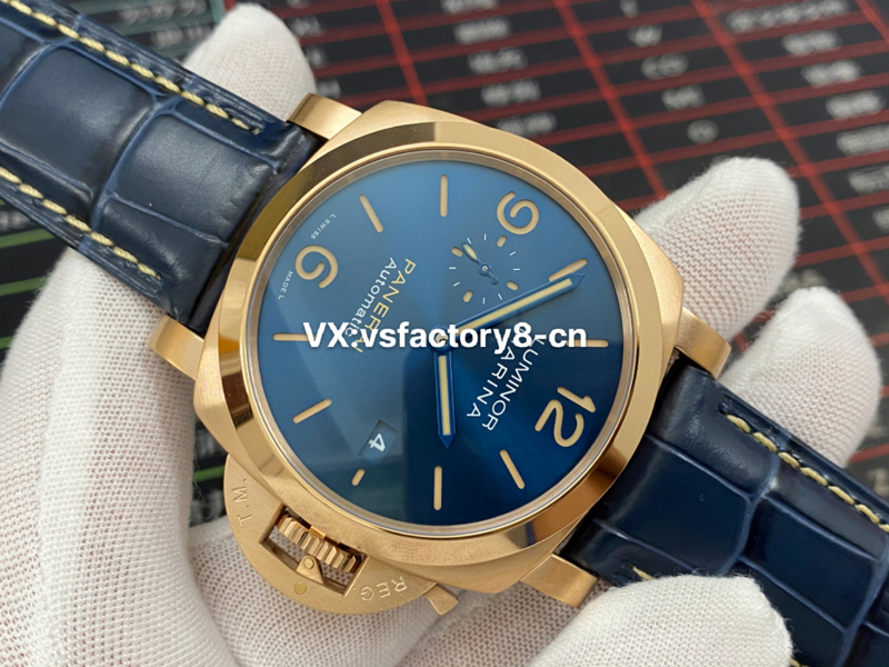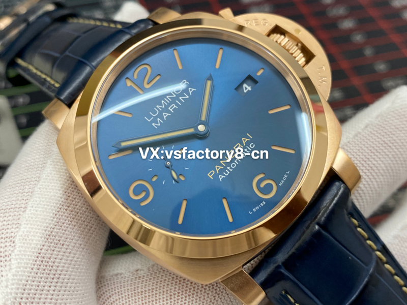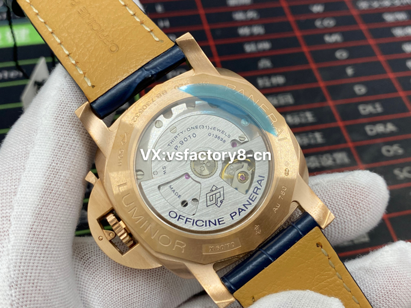 VS廠復(fù)刻表外觀其實跟其他沛納?;緵]什么區(qū)別,44mm的表徑,外觀也是精鋼進(jìn)行了真空電鍍,電鍍了18K金。