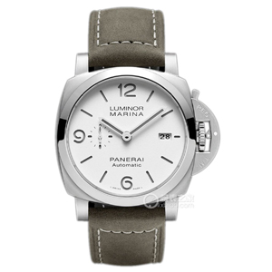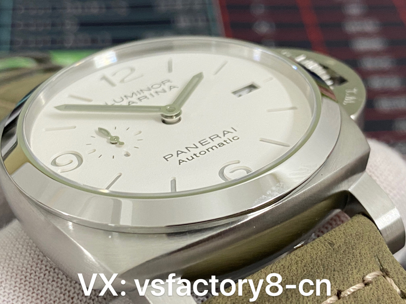 VS廠復(fù)刻表1314表盤選用小三針設(shè)計(jì),小秒盤設(shè)于9點(diǎn)鐘方位,日歷窗設(shè)于3點(diǎn)鐘方位,這種布局也是沛納海非常常見的一種,指針和時(shí)標(biāo)均為灰色,和白色表盤和諧搭配 。