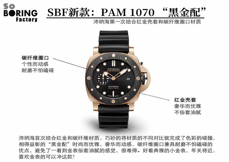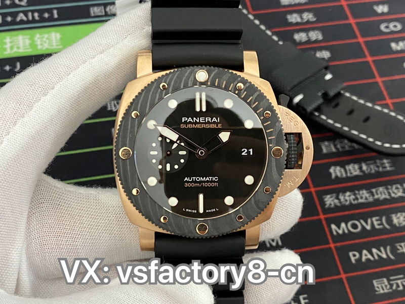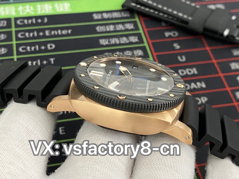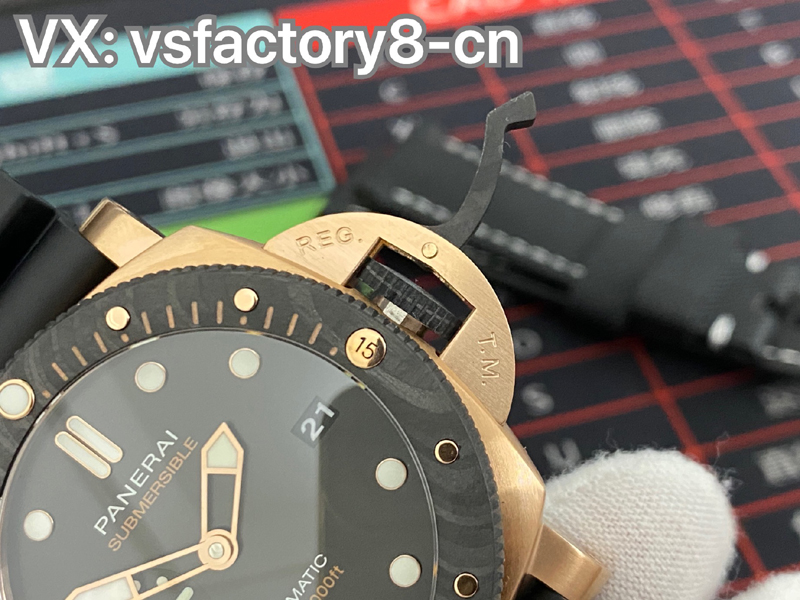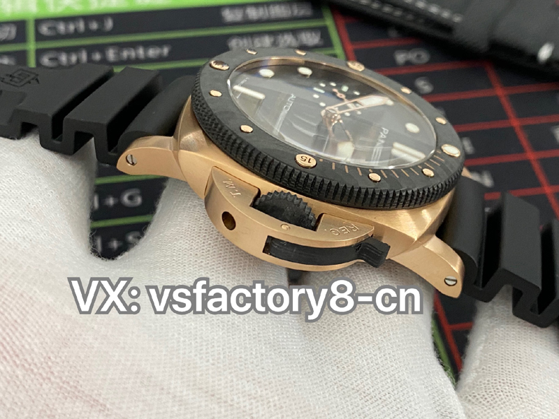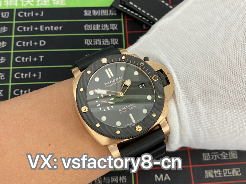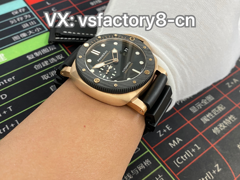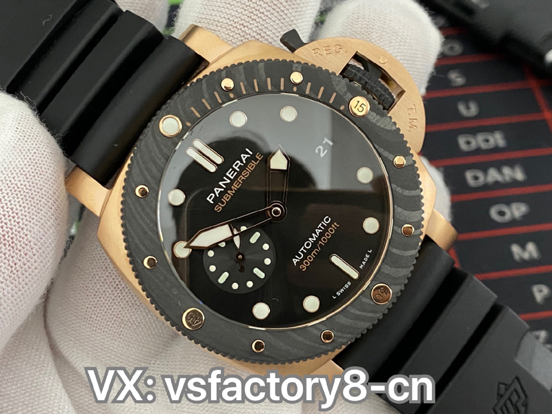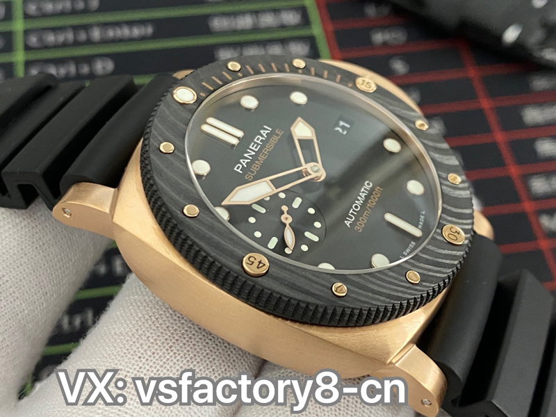 2022年(VS廠官網)旗下 SBF廠新款:VS工廠沛納海PAM1070 “黑金配”實拍圖,沛納海首次結合紅金和碳纖維材質,巧妙的將材質的不同對比就完成了色彩的碰撞,相得益彰的“黑金配”時尚而優雅,奢華而動感,碳纖維圈口兼具耐磨不怕磕碰的優點,避免了一看到金表俗套油膩的感覺,很難得。