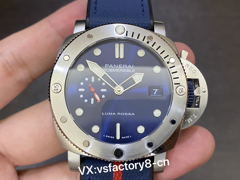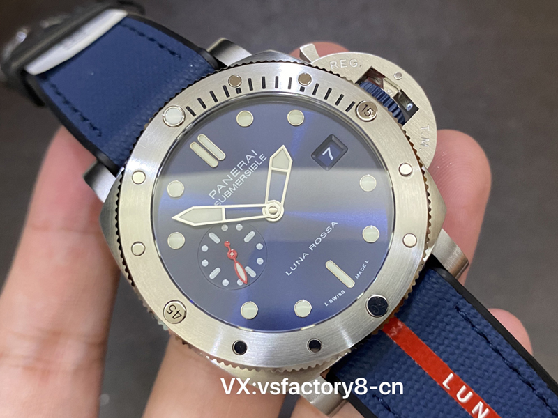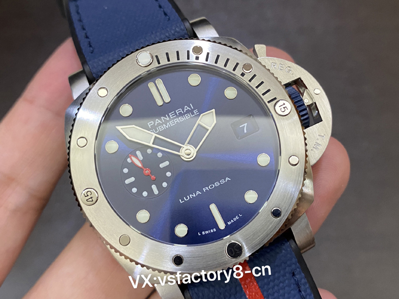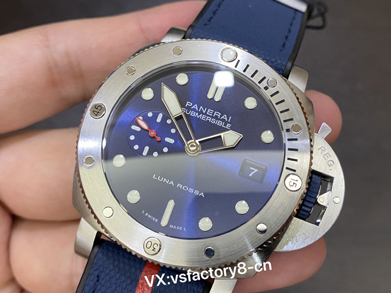 盤面9點(diǎn)鐘位置設(shè)有小秒盤,魚雷指針做成紅色,醒目,也為藍(lán)盤更添動(dòng)感,表盤上還帶有Luna Rossa名稱,以展現(xiàn)與該帆船隊(duì)的合作。