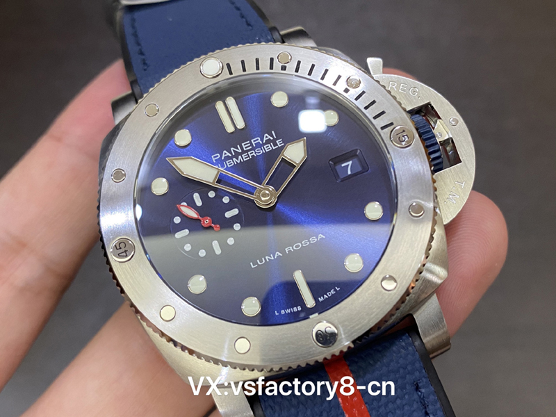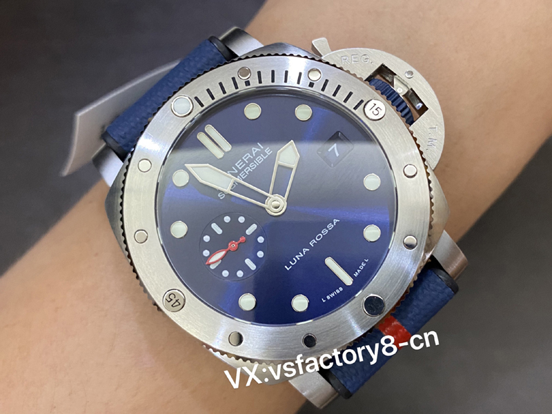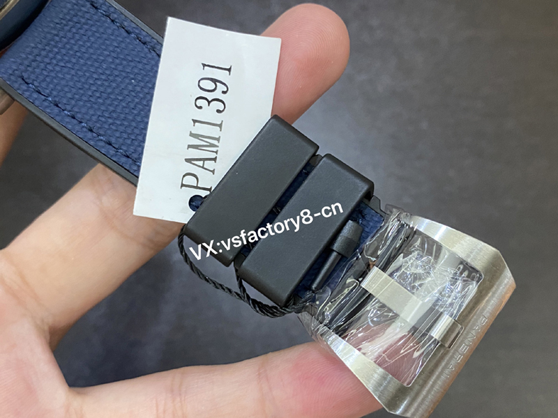 VS廠沛納海1391的字面采取藍(lán)色面,同正品沛納海1391做了太陽放射紋處理,會(huì)隨光照角度變化。