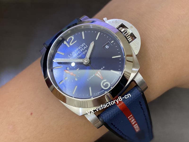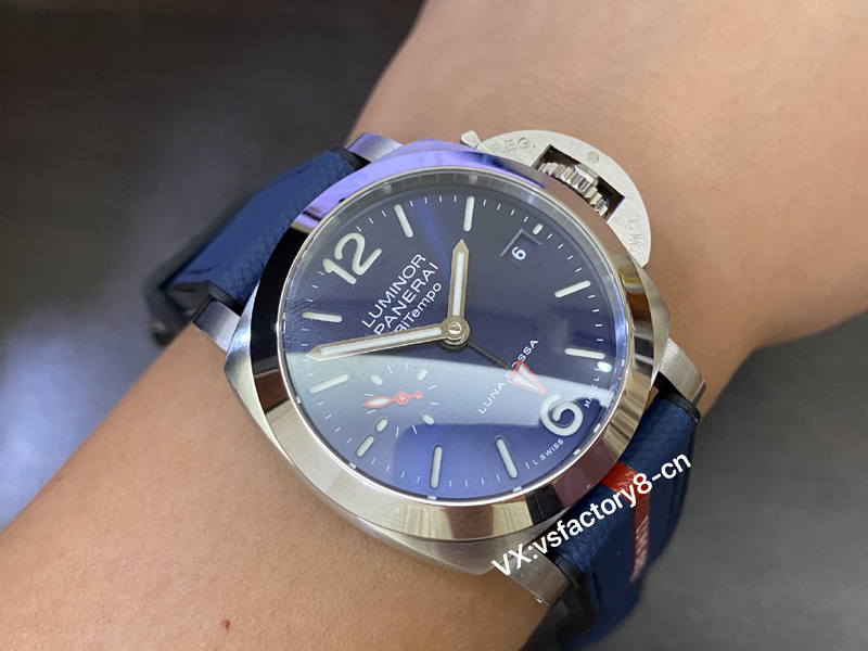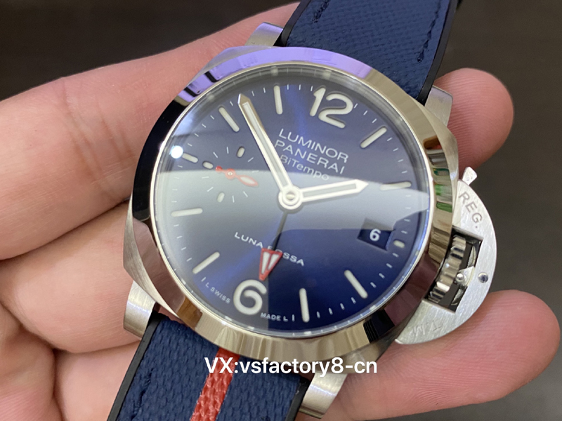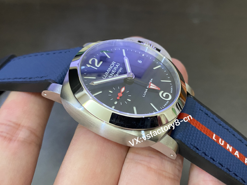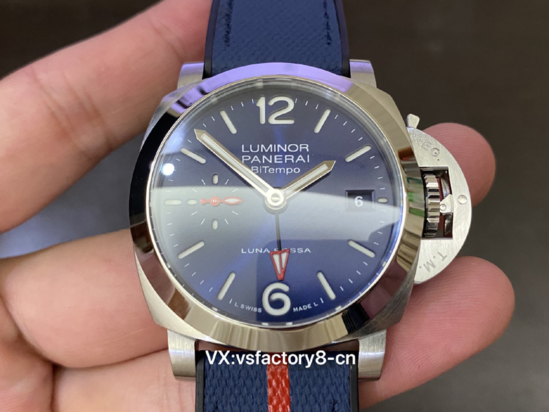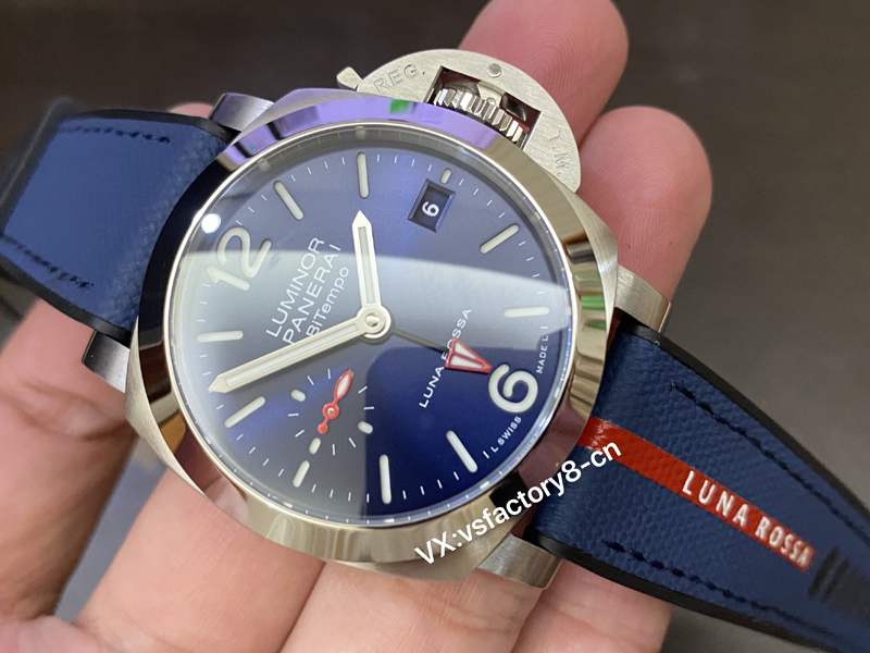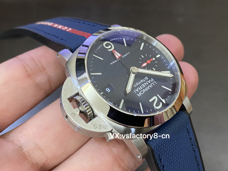 VS廠沛納海1404復(fù)刻表第二時區(qū)的時針尖端采用紅色鍍層處理,與Luna Rossa船隊的船帆顏色巧妙呼應(yīng)。