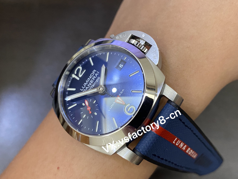 VS廠沛納海1404復(fù)刻表采用40毫米精鋼表殼,配備藍(lán)色太陽放射紋表盤。