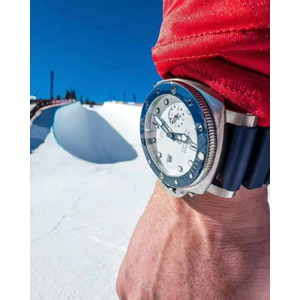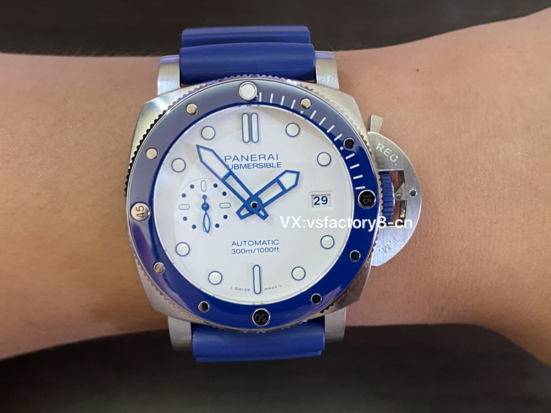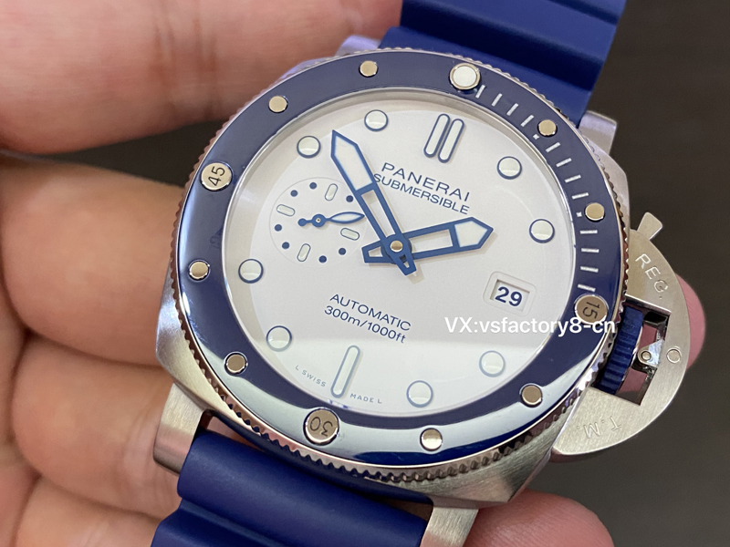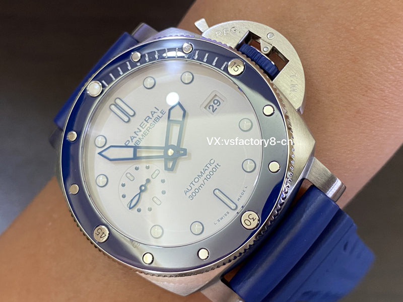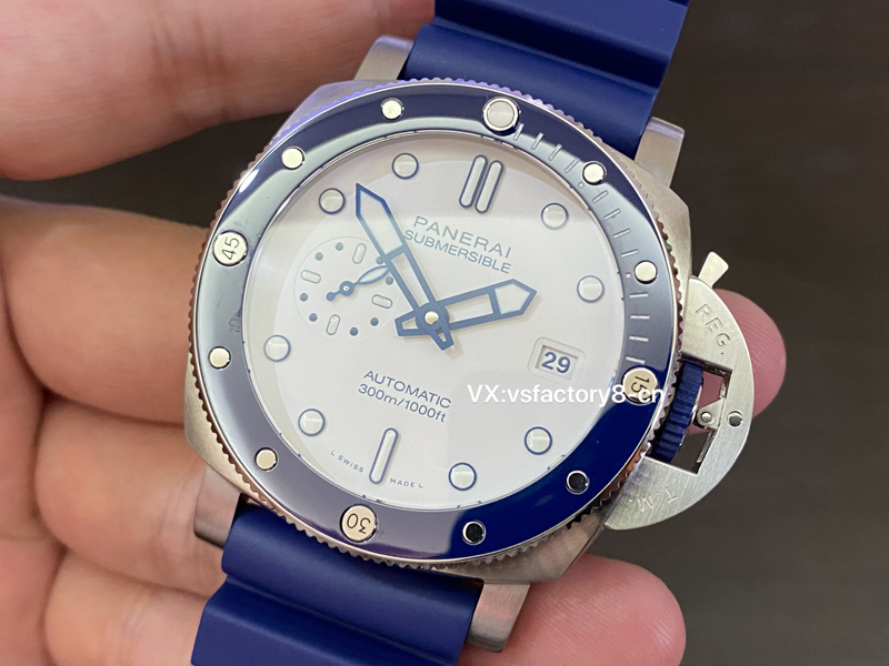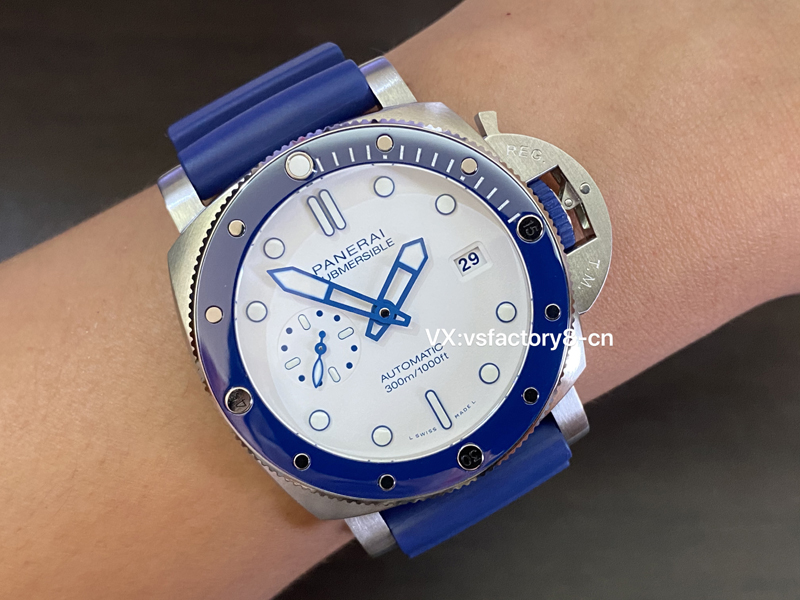 沛納海pam1696復刻表清爽的白色表盤點輟藍色元素,向白雪皚皚的山峰和神秘深邃的海洋致敬!