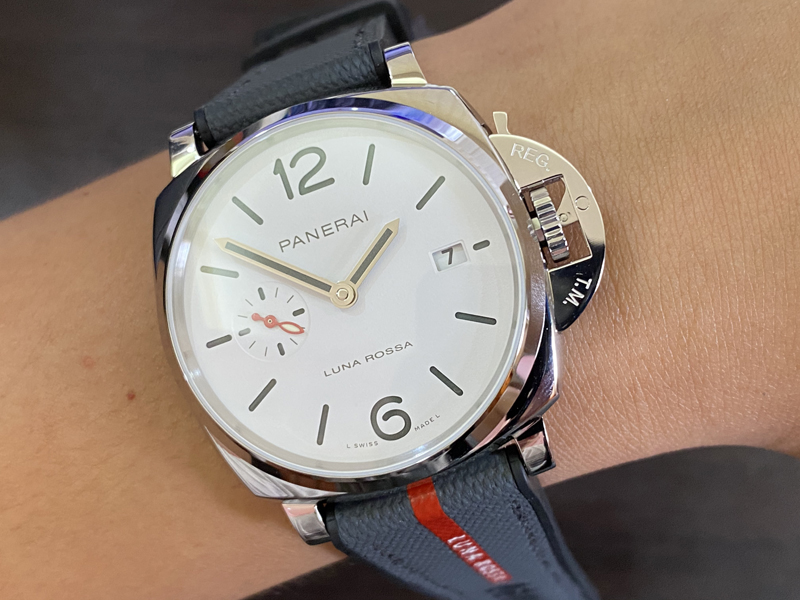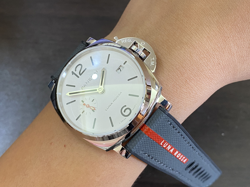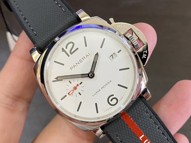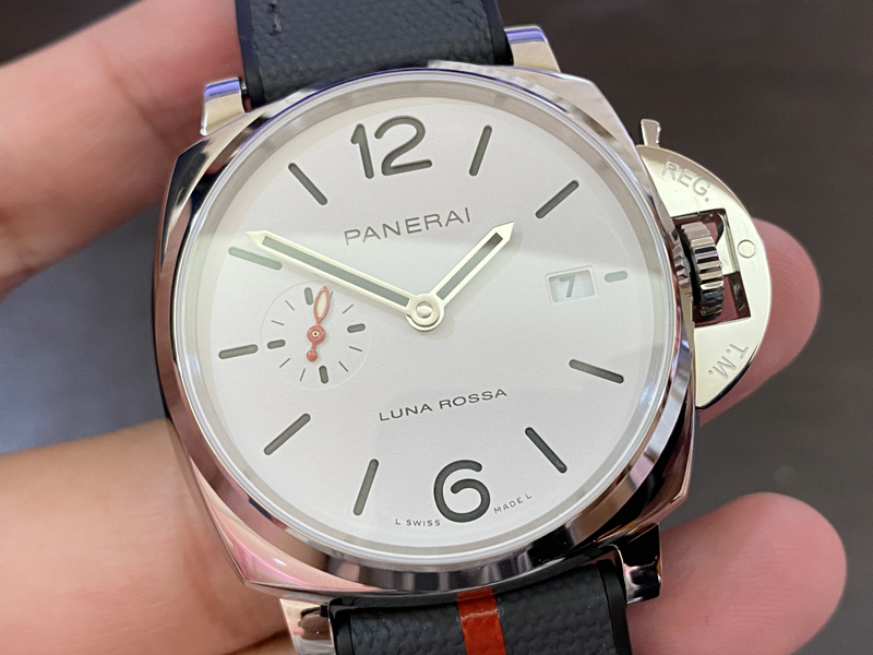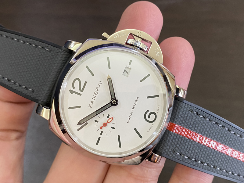 全新一比一天然橡膠沛帆布表帶,白色表盤搭載醒目紅色秒針。