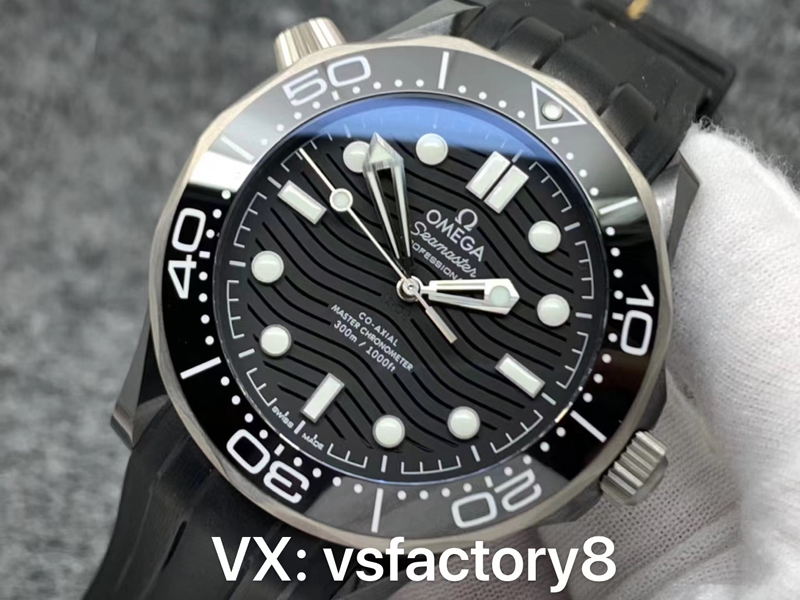 VS廠歐米茄海馬300米潛水表系列,自動機械表男表43.5mm全陶瓷表殼,黑色陶瓷?潛水刻度單向旋轉表圈,防劃藍寶石玻璃鏡面,黑色波紋表盤,自動上弦8806機械機芯,黑色表扣,黑色橡膠表帶 。