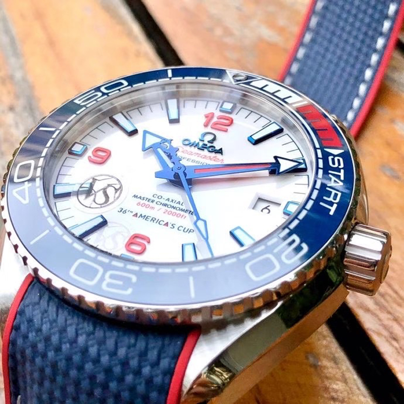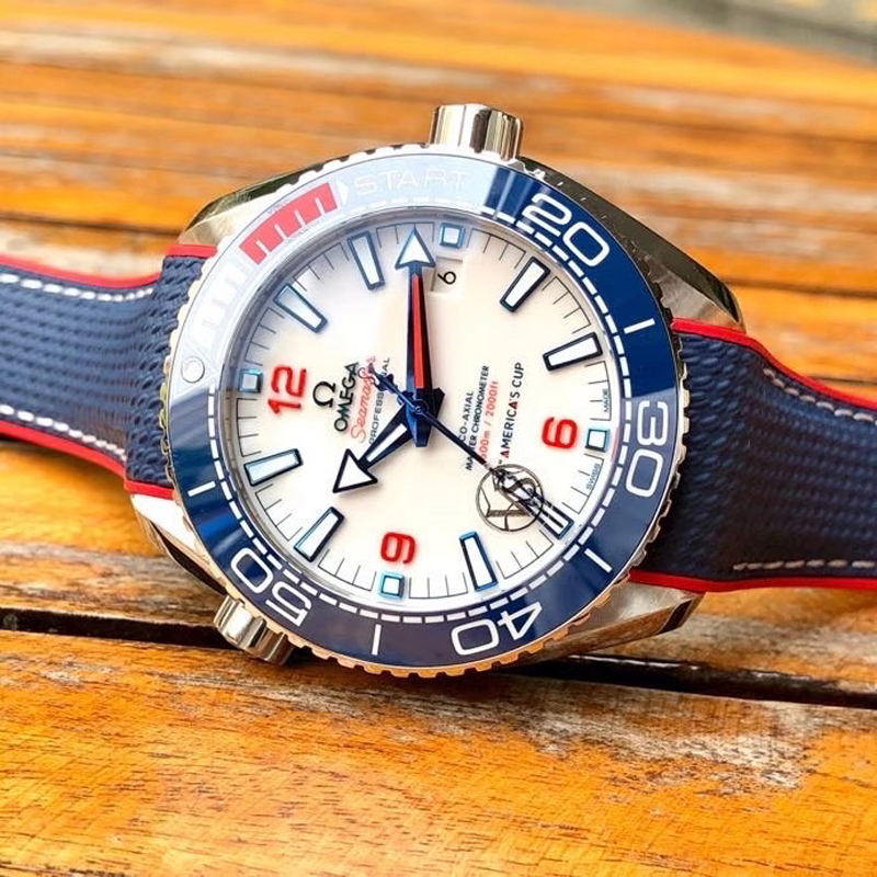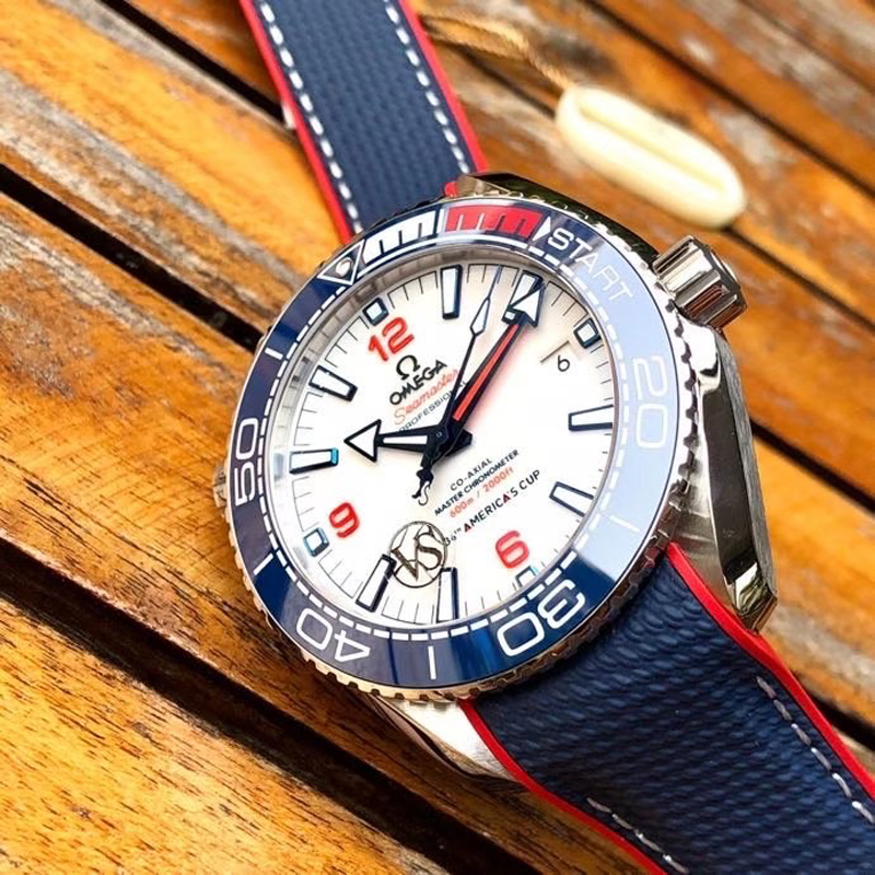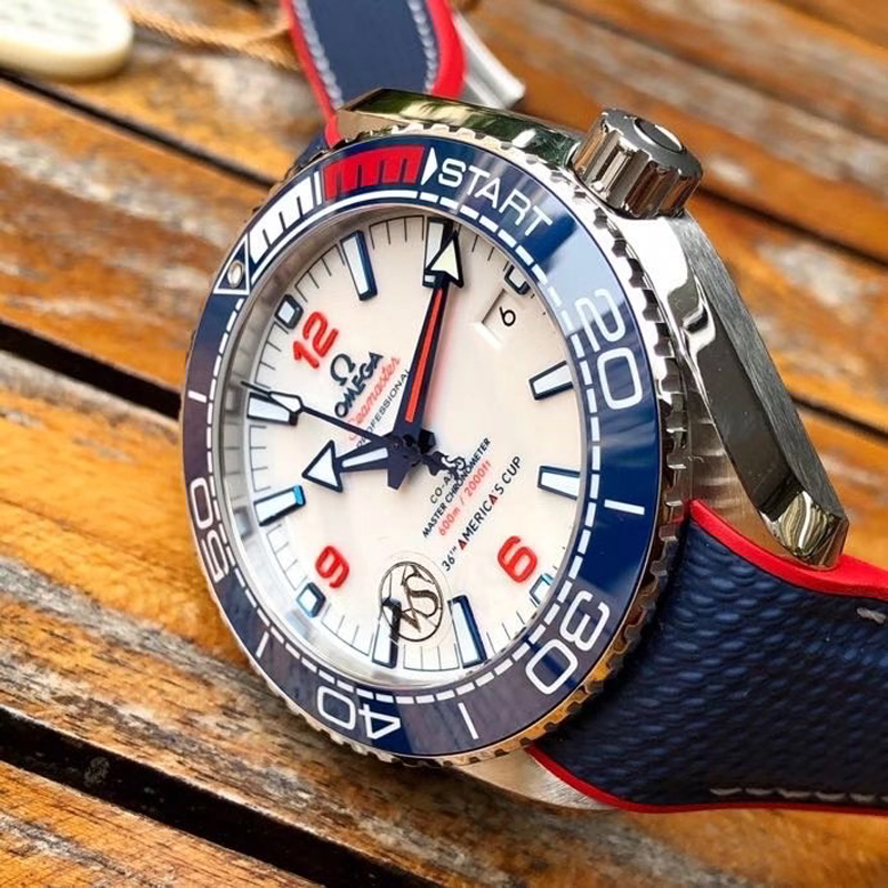 VS廠歐米茄43.5MM復刻表旨在致敬美洲杯帆船賽,歐米茄海馬表殼為不銹鋼材質打造,表圈的藍色則是藍色氧化鋯 (ZrO2) 也就是陶瓷表圈。