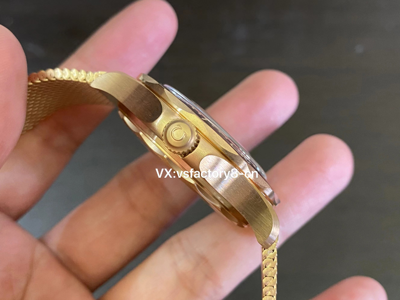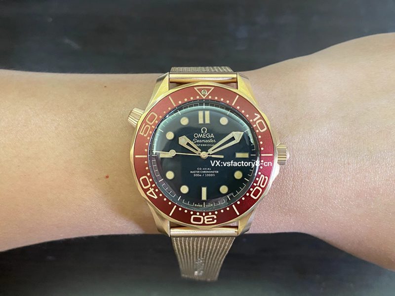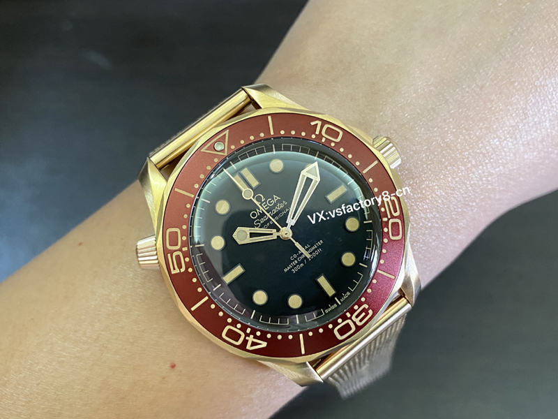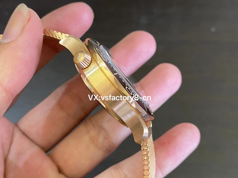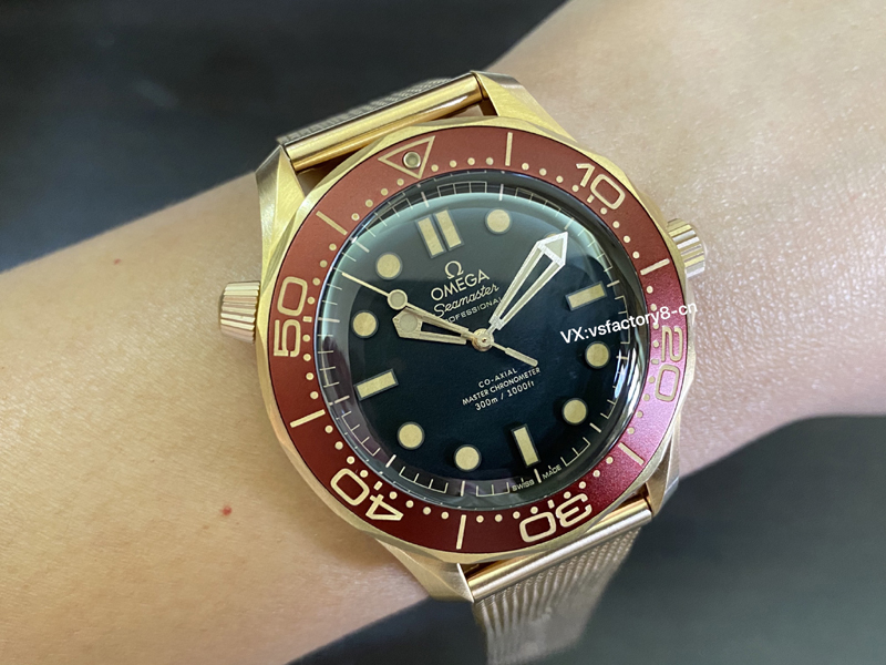 在外觀處理上,VS廠歐米茄海馬300米青銅金,整表全部拉絲。