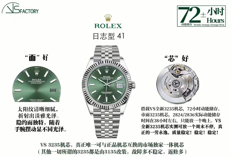 2,VS廠丹東3235機芯,真正唯一可與正品機芯互換的市場獨家一體機芯(其他一切所謂的3235都是由3135改裝,故障多不穩定,返修多)樣板大貨一樣的標準,不夸大宣傳,3235日志的最佳選擇。