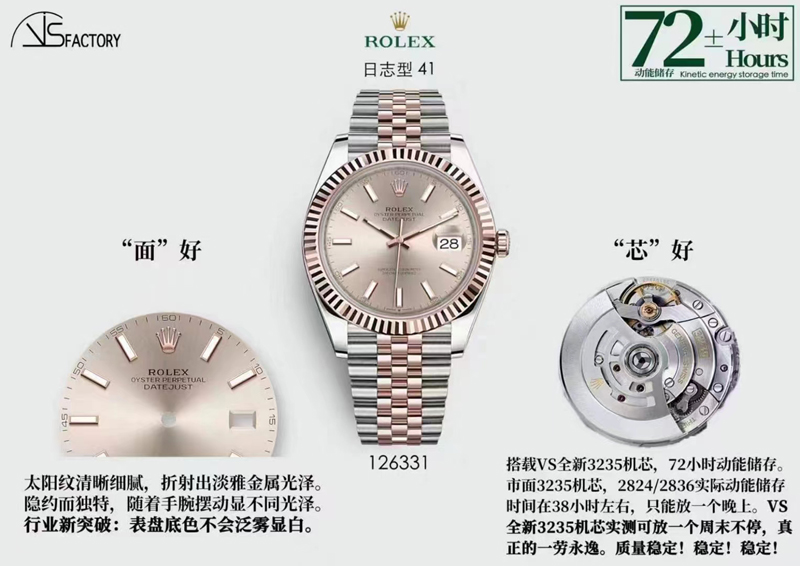 VS工廠搭載全新丹東3235一體機芯,72小時儲存動能,市面上3235機芯,均為2824/2836海鷗機芯改裝成3235機,實際動能儲存時間在38小時左右,只能放一個晚上!