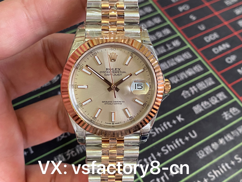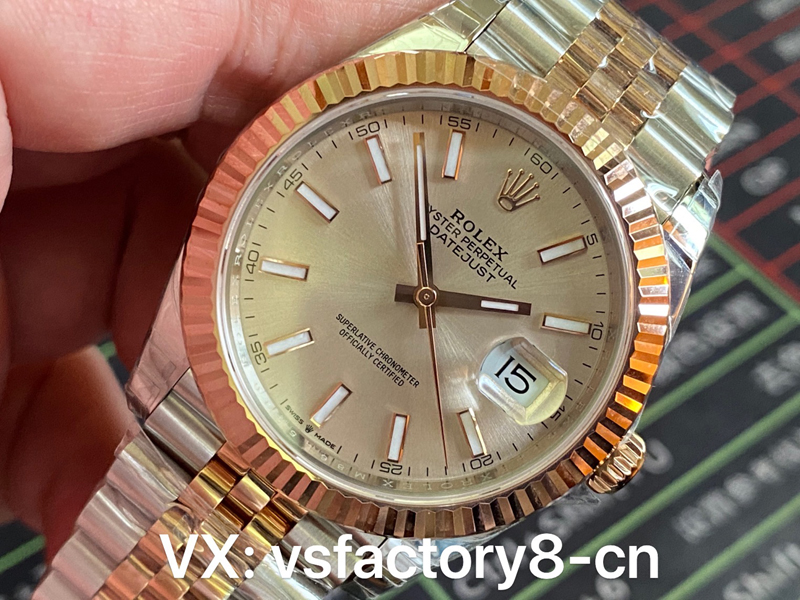 VS廠勞力士香檳色日志41M“面”好,表盤太陽紋清晰細膩,淡雅光澤,隱約而獨特,隨著手腕擺動顯不同光澤,VS廠行業新突破:表盤底色不會泛霧顯白。