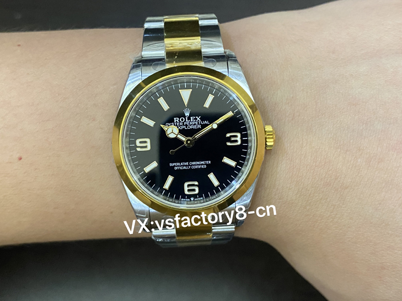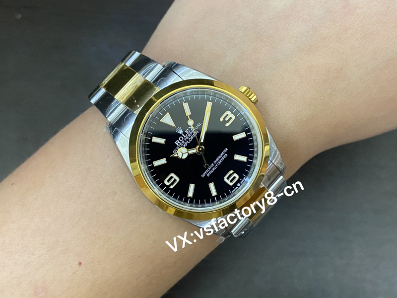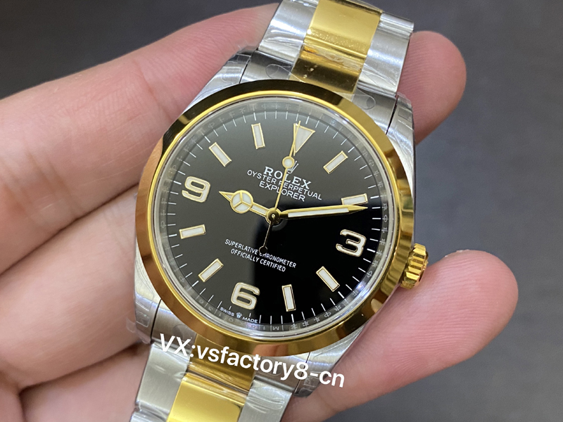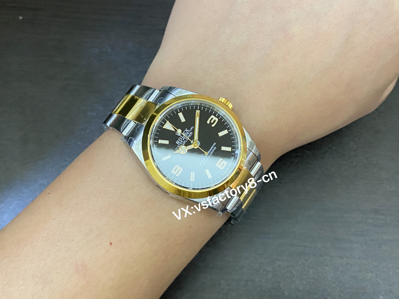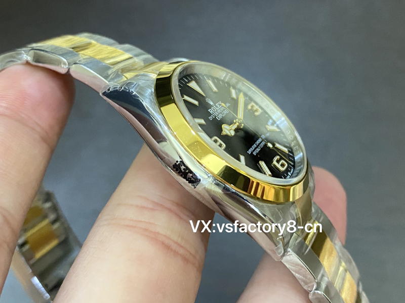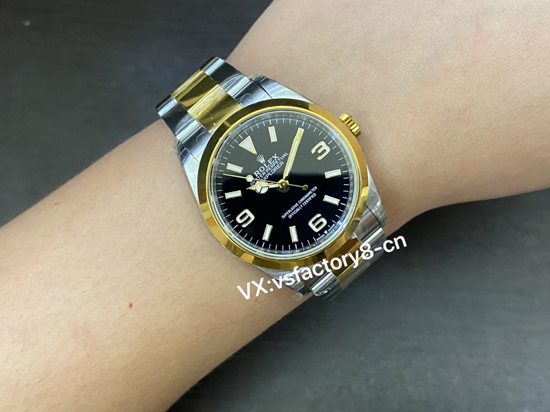 VS廠新款勞力士間金探險家采用904L精鋼鋼與真空電鍍18K斤材質,其中外圈、表冠與表帶中間鏈節采用18K金真空電鍍打造而成。