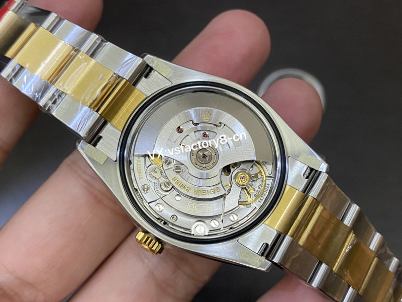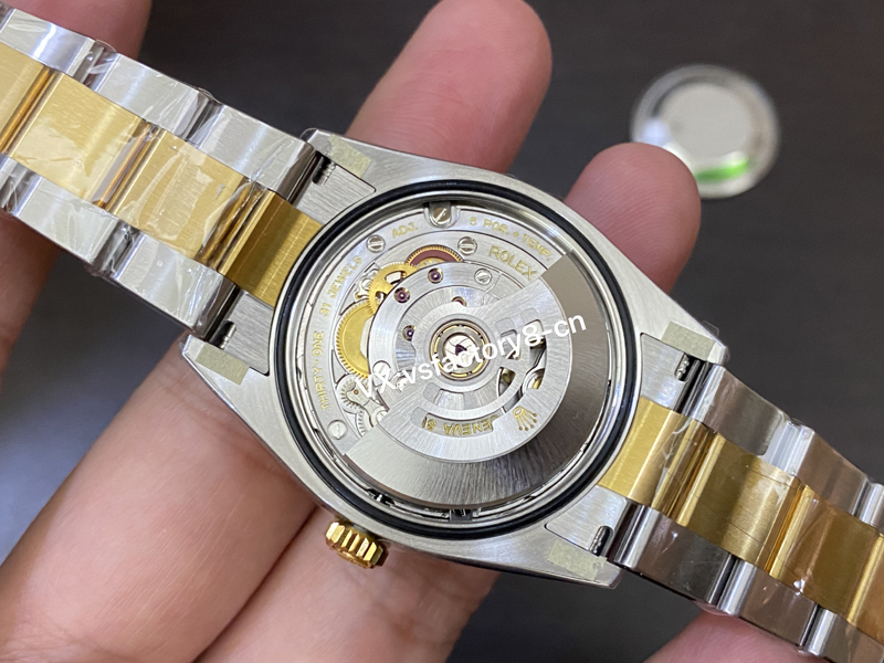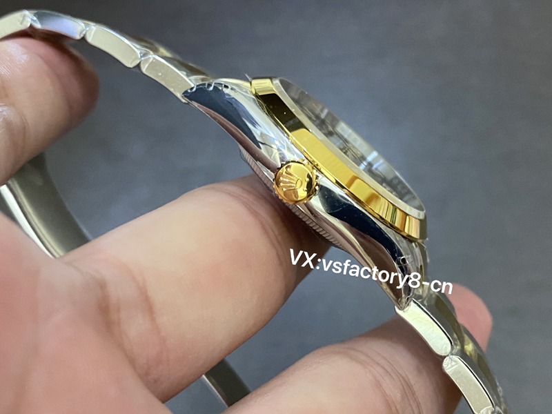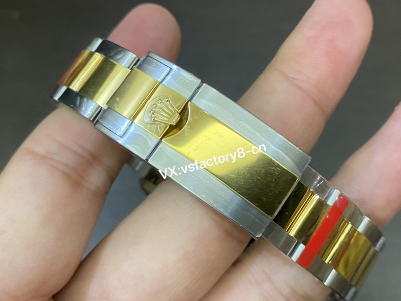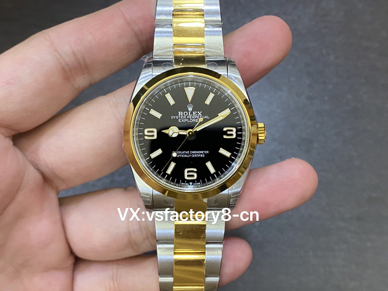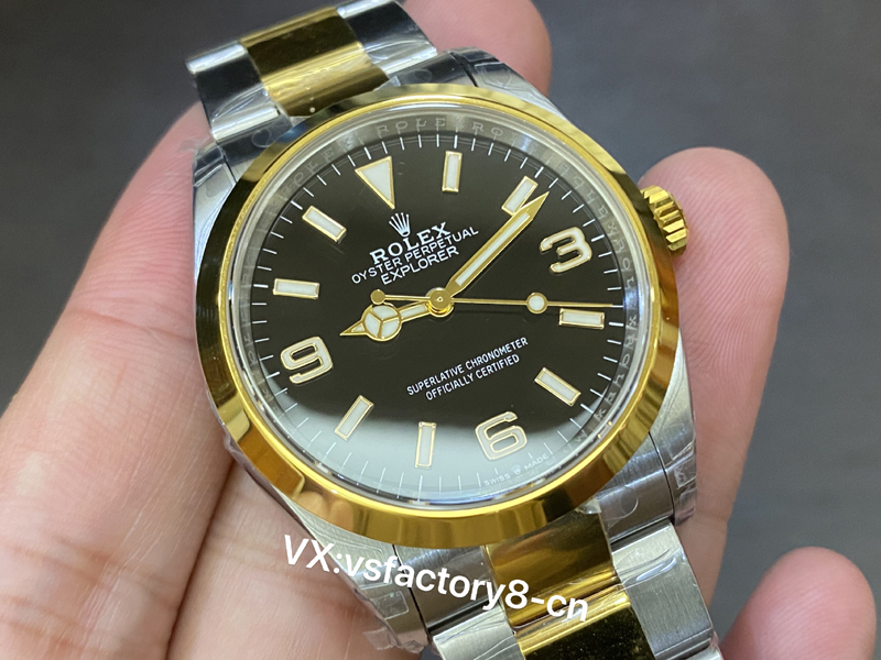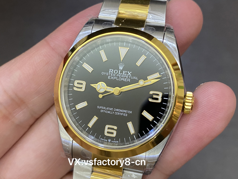 VS廠新款勞力士間金探險家采用904L精鋼鋼與真空電鍍18K斤材質,其中外圈、表冠與表帶中間鏈節采用18K金真空電鍍打造而成。